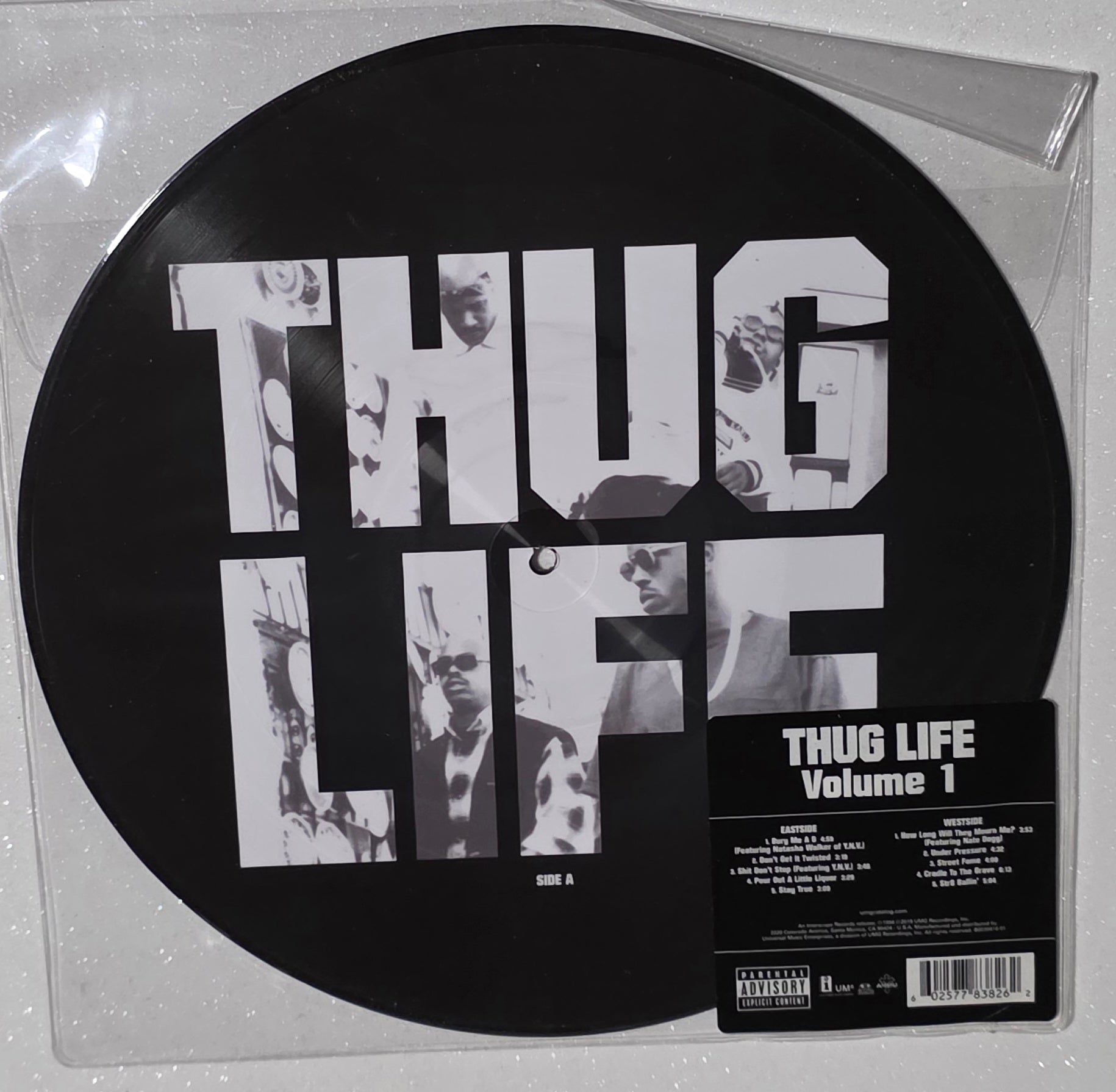 Picture Disc LP. Thug Life: Volume 1 is the only studio album by American hip hop group Thug Life, started by 2Pac. It was released on September 26, 1994, by Interscope Records. The group featured Big Syke, Macadoshis, Mopreme, The Rated R, and 2Pac.
