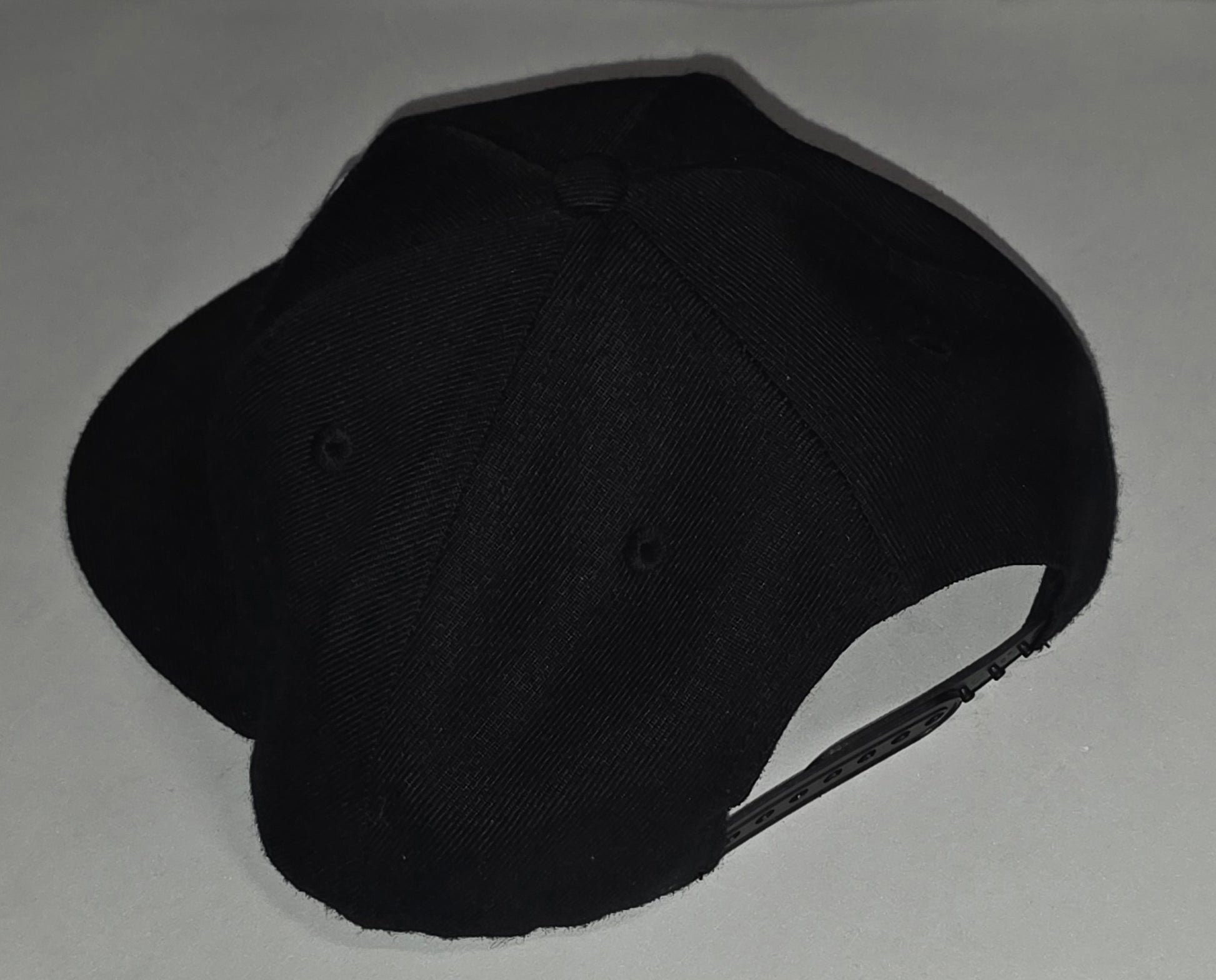 Black snapback hat with white embroidered logo.
